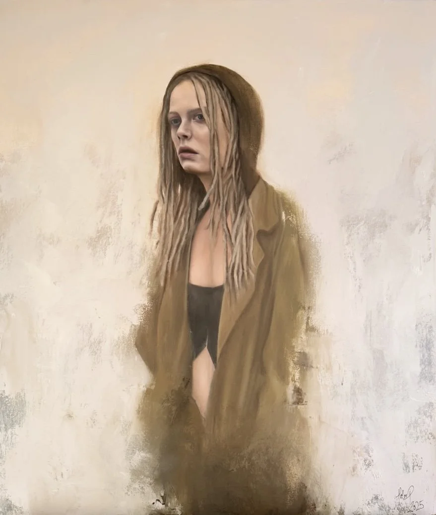Hun bærer et ydre af styrke, et forsøg på at opbygge et skjold mod verden, men bag det hårde blik anes tyngden af alt det, hun forsøger at holde på afstand.